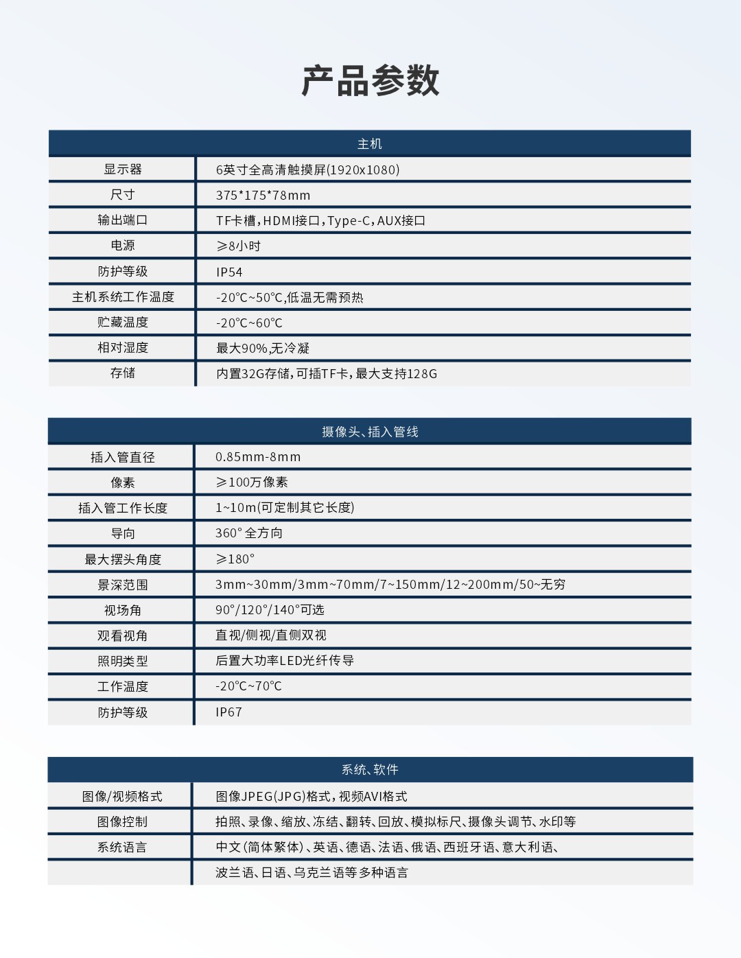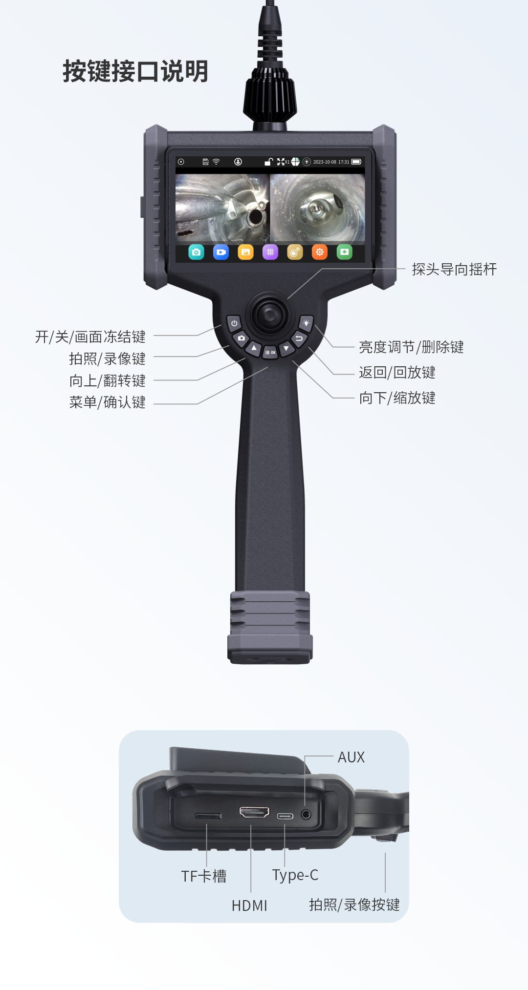 優(yōu)勢特點(diǎn):6英寸高清觸摸屏、快速更換管線、360°全方向擺頭、后置LED光纖導(dǎo)光、18650電池,工作時(shí)長≥8