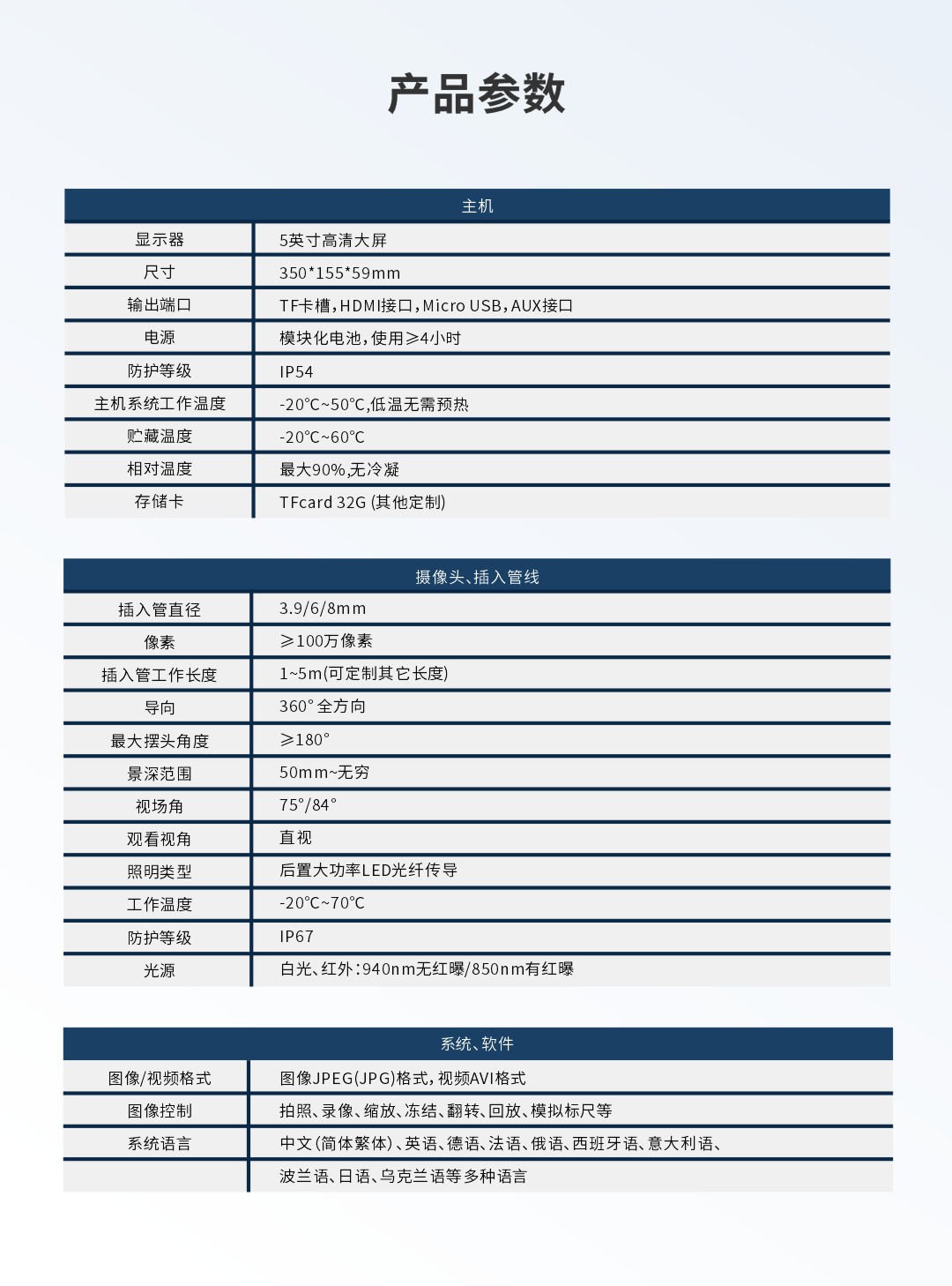 優(yōu)勢(shì)特點(diǎn):紅白雙光源一鍵切換;攝像頭拾音、錄音功能;探頭360°轉(zhuǎn)向;可更換不同類型管線;